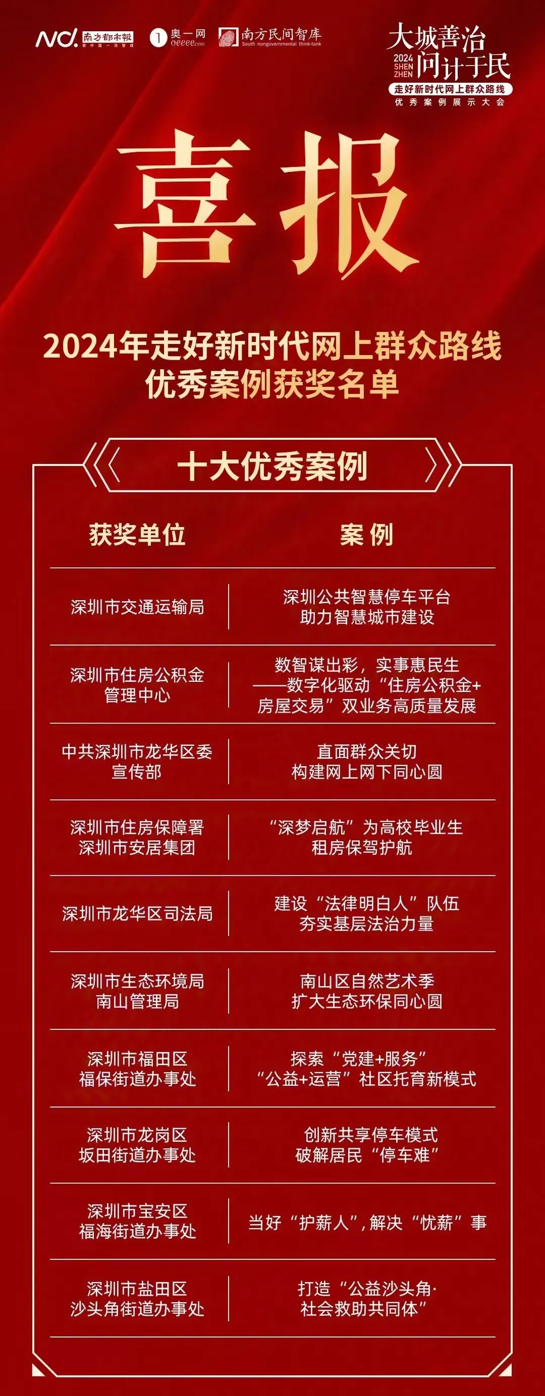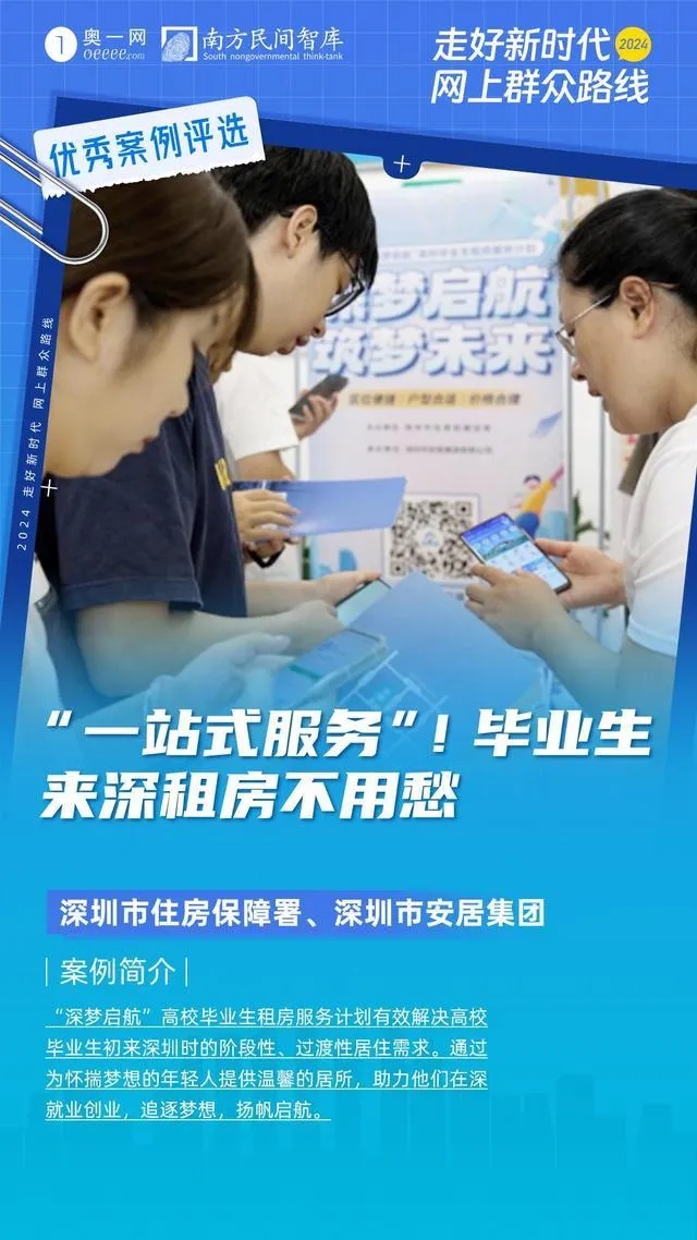 经充分调研、多方评审,最终评选出深入践行党的群众路线,网上用心听民意,网下用力解民忧的十大优秀案例和十大创新案例。其中,深圳市住房保障署、深圳市安居集团申报案例“深梦启航”为高校毕业生租房保驾护航从200多个案例中脱颖而出,荣登十大优秀案例获奖名单。