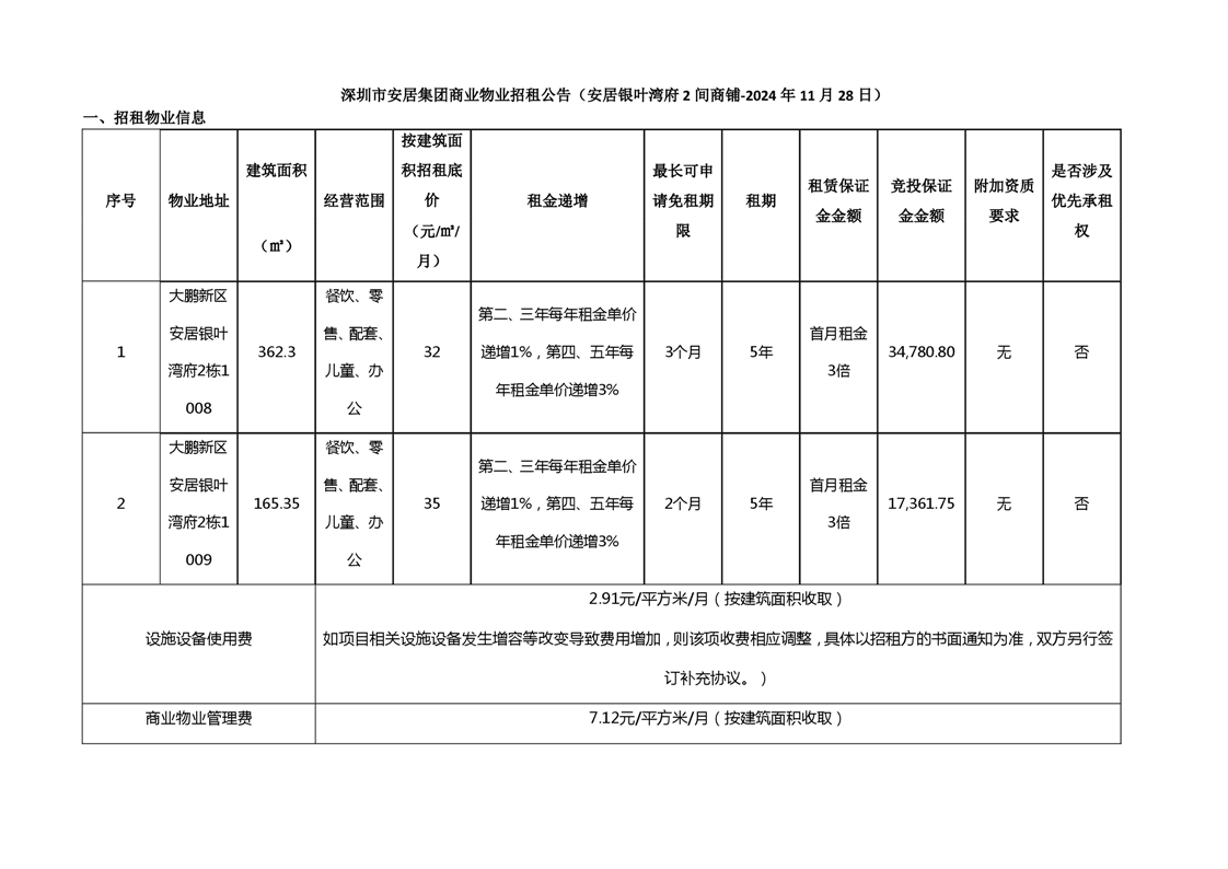深圳市安居集团商业物业招租公告-(安居银叶湾府2间商铺)