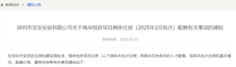 关于住房申请条件、申请材料、房源安排、选房方式、配售程序及其他提示,请查阅同步发布的《深圳市宝安区住房和建设局关于海岸悦府项目剩余住房(2025年2月批次)配售的通告》。