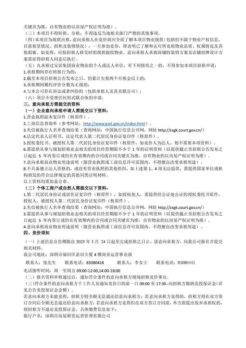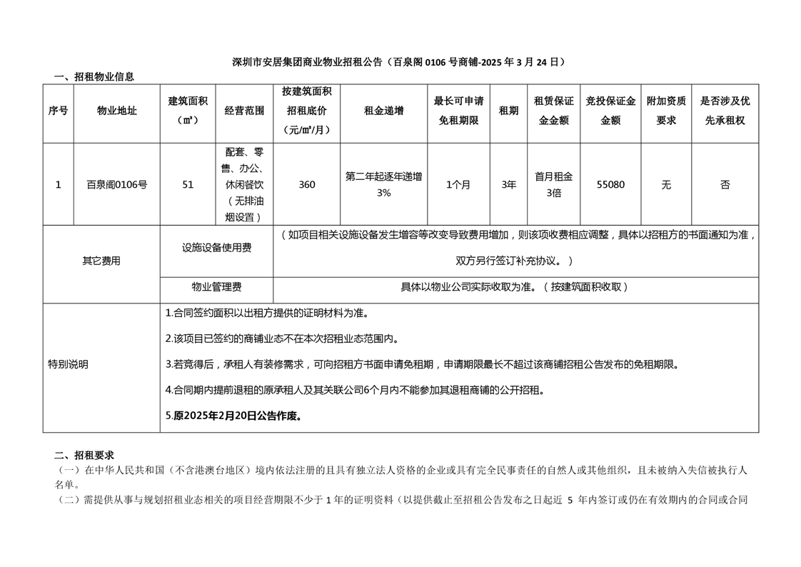 深圳市安居集团商业物业招租公告(百泉阁0106号商铺)