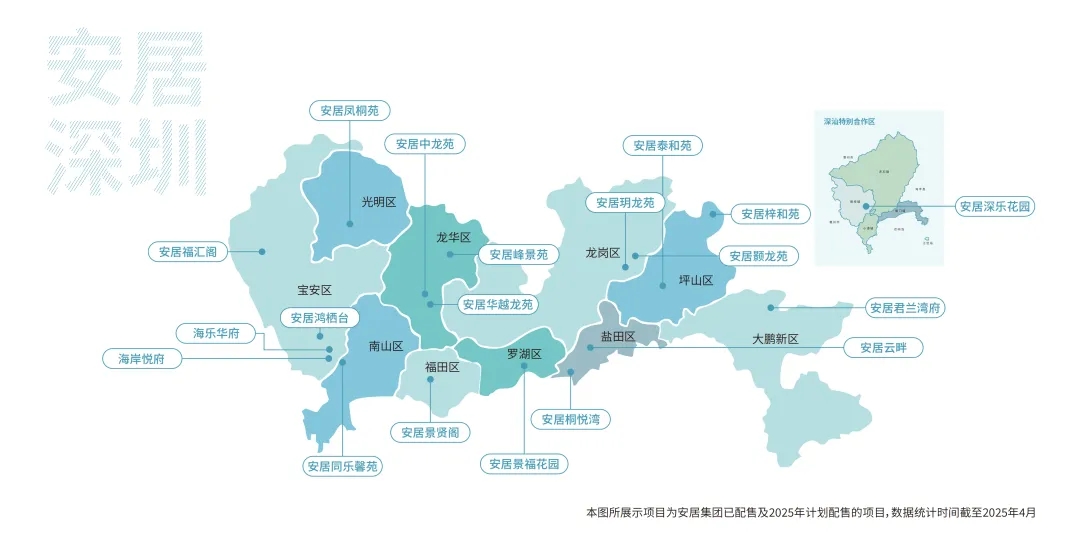 最受关注的预计就是“可售房源展示区”。截至目前,安居集团已成功配售14个项目,覆盖深圳9个区,累计供应住房约0.79万套,总面积达63万平方米。2025年,安居集团将计划推售20个项目,涉及超房源6000套。