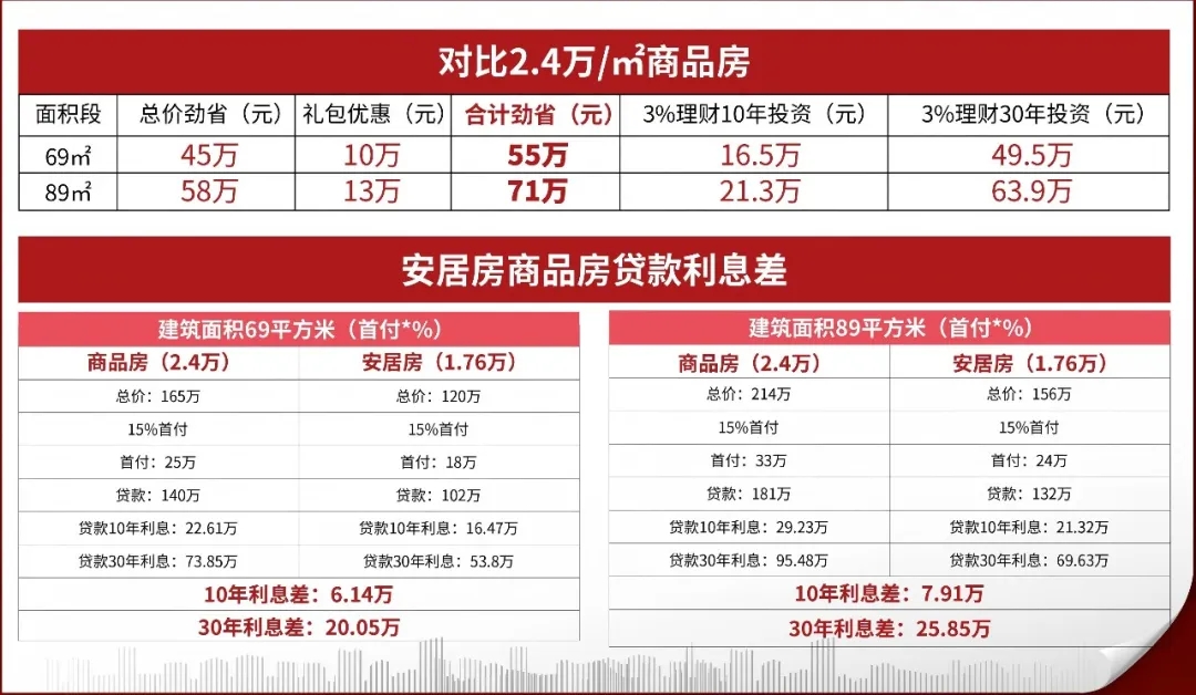 对比市场价约2.4万/㎡的商品房,约69㎡安居房两房产品最少可节省约55万元 ,约89㎡安居房三房产品最少可节省约71万元 。