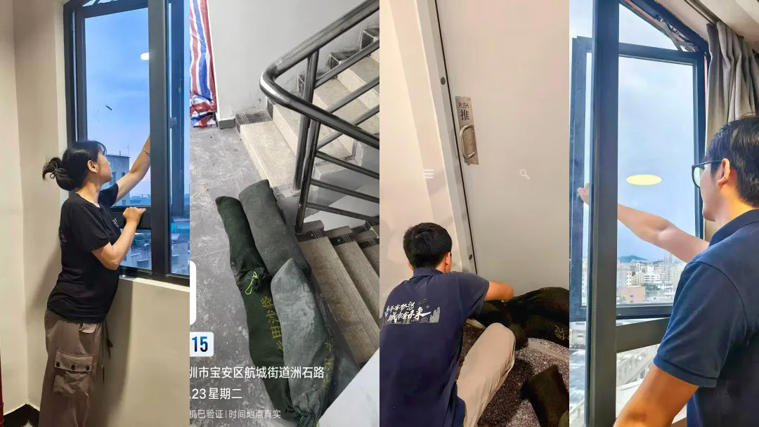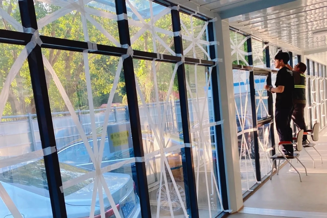 ▲ 罗湖区西璟学府项目在台风来临前张贴米字胶带