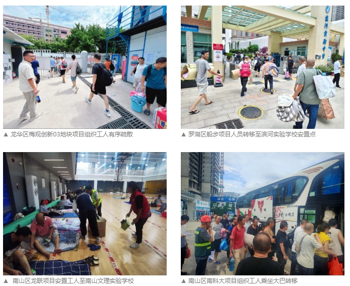 深圳市安居集团第一时间落实省、市防汛防台风工作部署,9月22日立即召开防台风安全生产部署紧急会议,启动应急响应机制,并组织所属企业针对51个在建项目、52个自营物业项目,以及城中村板块等防范重点开展排查整治。专项三防方案制定和落实率100%、参建人员安全转移率100%、专项检查276次,出动人员890人次,确保了安全平稳态势,获得业主住户的充分肯定。