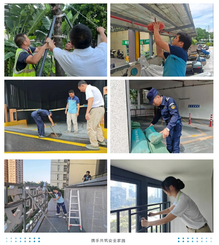自营物业52个项目,组织防台风专项检查276次。各项目及时对住户进行防台风提示提醒,组织专人开展“拉网式”巡查,逐层逐户检查并关闭所有楼栋的外窗,根据实际配备防汛沙袋、挡板、水泵等应急物资,对供用电设施、屋面光伏、雨棚等临建、户外广告牌、灯箱、排水设施、树木、危险边坡等进行了检查,及时处置存在的风险点。