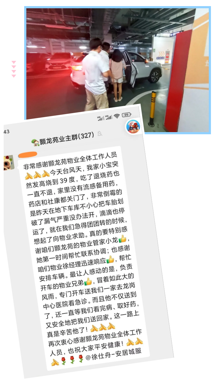 9月24日12时许,龙岗区颢龙苑C座某业主莫女士家中幼童突发高烧、持续不退,需立即前往医院接受诊治。但当时公共交通停运,业主在万般无奈且紧急情况下,向运营服务中心寻求帮助。中心果断采取行动,克服台风天气带来的困难,紧急调配可供使用的应急车辆及具备安全驾驶条件的值班人员,将业主及其发烧幼童紧急送往附近指定医院。后该业主在小区微信群对物业工作人员进行点赞表扬。