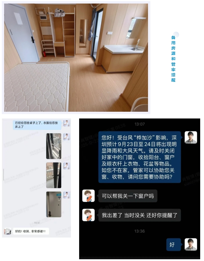 各运营门店组织开展对1023栋运营楼栋应急物资、外立面附着物、门窗玻璃等进行排查,并落实整改闭环;储备1051间应急房间,供广大租户台风期间紧急使用;通过企业微信向87000+人发去防台风提醒,主动询问1500+客户,帮438户有需要的租户关紧门窗、锁好阳台。