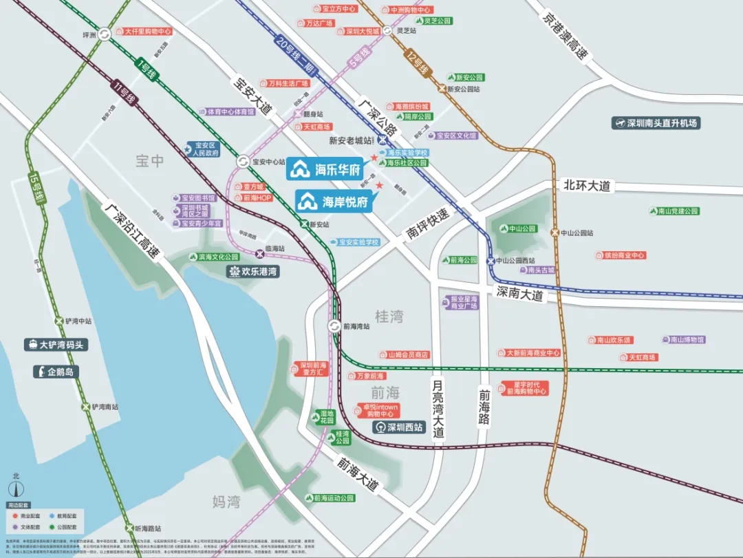 地铁1/5/11/12/20号线(在建中)五线环绕,新安站/翻身站/新安老城站(在建中)三地铁口,1站宝中、1站前海。