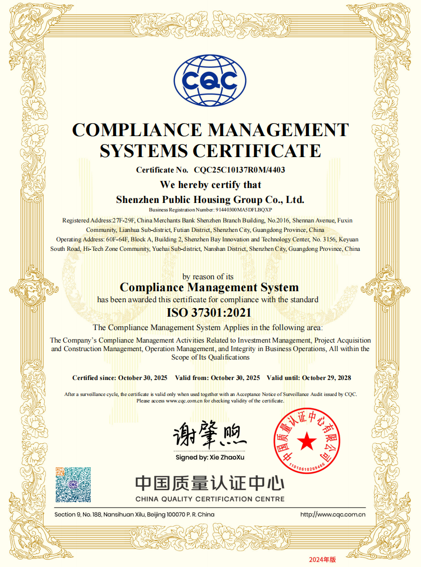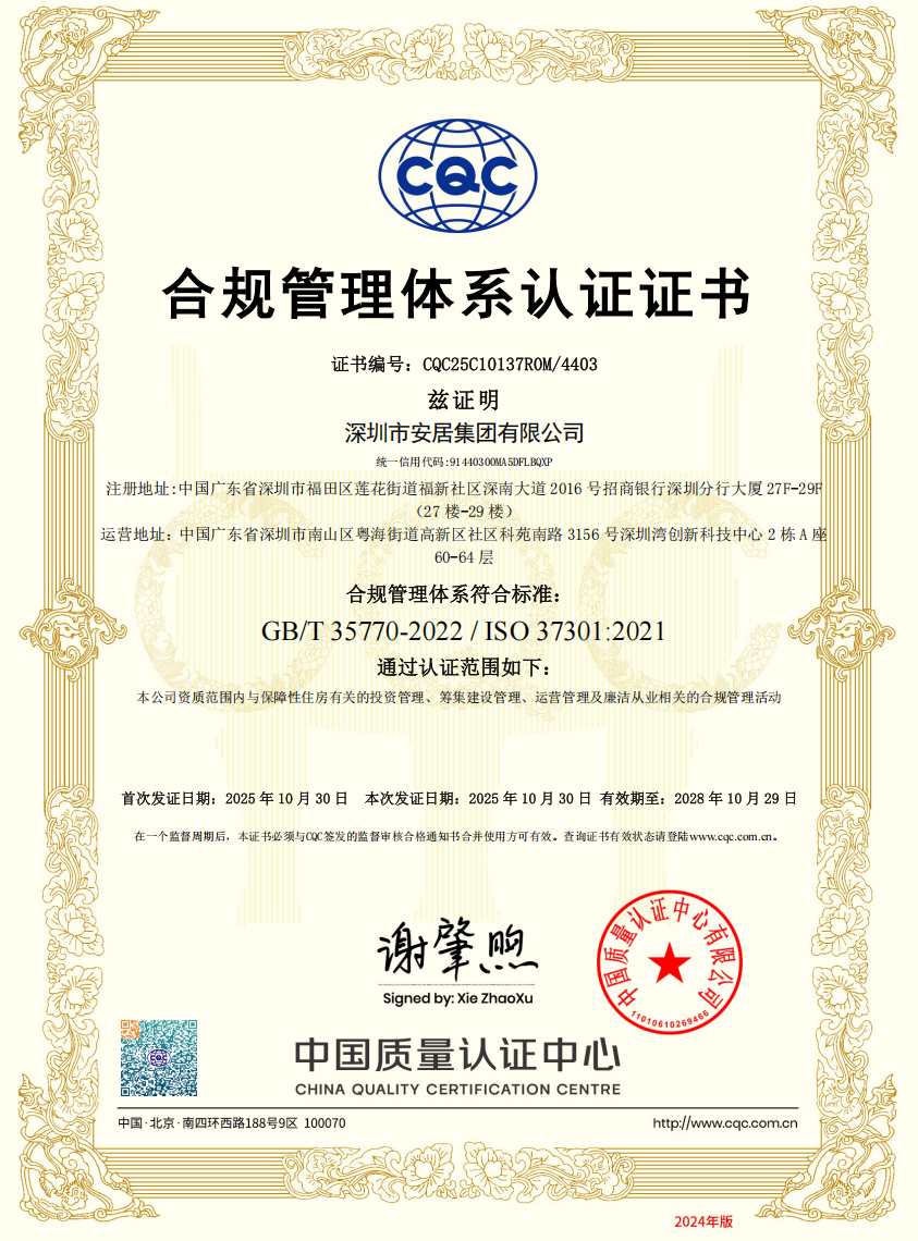 2025年10月30日,安居集团成功通过GB/T35770-2022/ISO37301:2021《合规管理体系要求及使用指南》国际标准和国家标准“双标”评审,获得合规管理体系认证证书。认证中心专家组开展了资料审查、现场访谈等评估,高度认可安居集团合规成效,认为集团合规管理体系贴合保障性住房场景,核心领域均满足双标准要求。安居集团本次合规认证范围覆盖了公司资质内与保障性住房相关的投资管理、筹集建设管理、运营管理及廉洁从业合规活动,标志着集团保障性住房全链条合规管理迈入标准化新阶段。